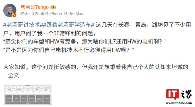 IT之家 7 月 14 日消息配资排排网,理想汽车第一产品线总裁汤靖昨日晚发文回应了 L7 车型用“HW 电机”相关问题,包括使用“HW 电机”是否是因为技术不行、使用该电机是否担心被卡脖子等。综合评论区讨论及常见厂商名称缩写规律来看“HW 电机”预计指“华为电机”。