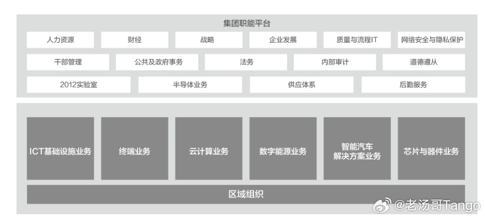 汤靖还针对两家整车产品有竞争,是否担心“被卡脖子”这一问题进行解答:“不怕,因为和整车竞争的是各‘界’,属于 HW‘消费者终端业务’板块,给我们供后电机的是 HW‘数字能源业务’板块,它们是‘兄弟’,但都已经分别‘成家立业’了,都是分别独立经营的。”汤靖还附上了“HW 业务架构图”。